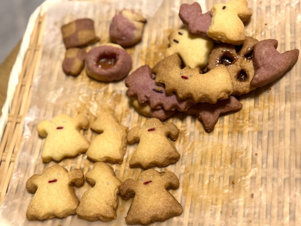 - 混ぜたら完成なので、あとは型抜きなど好きに子どもにやってもらえる。ちょうどハロウィンだったので、100均で買ったクッキー型が大活躍。作っているうちに、顔をつけたい!、色を変えたい!というので紫芋パウダーを入れたり、ステンドグラス風にしたい!とうので飴を入れてみたりとアイディアがたくさん沸いたようです。