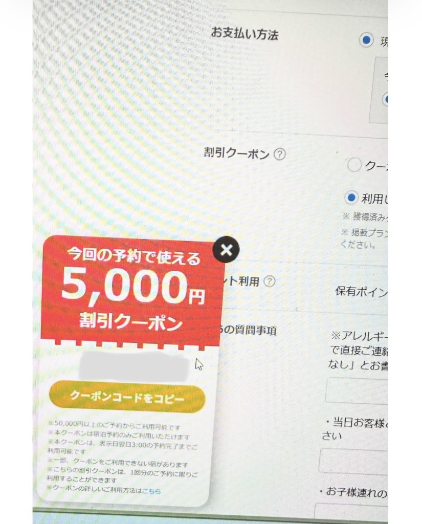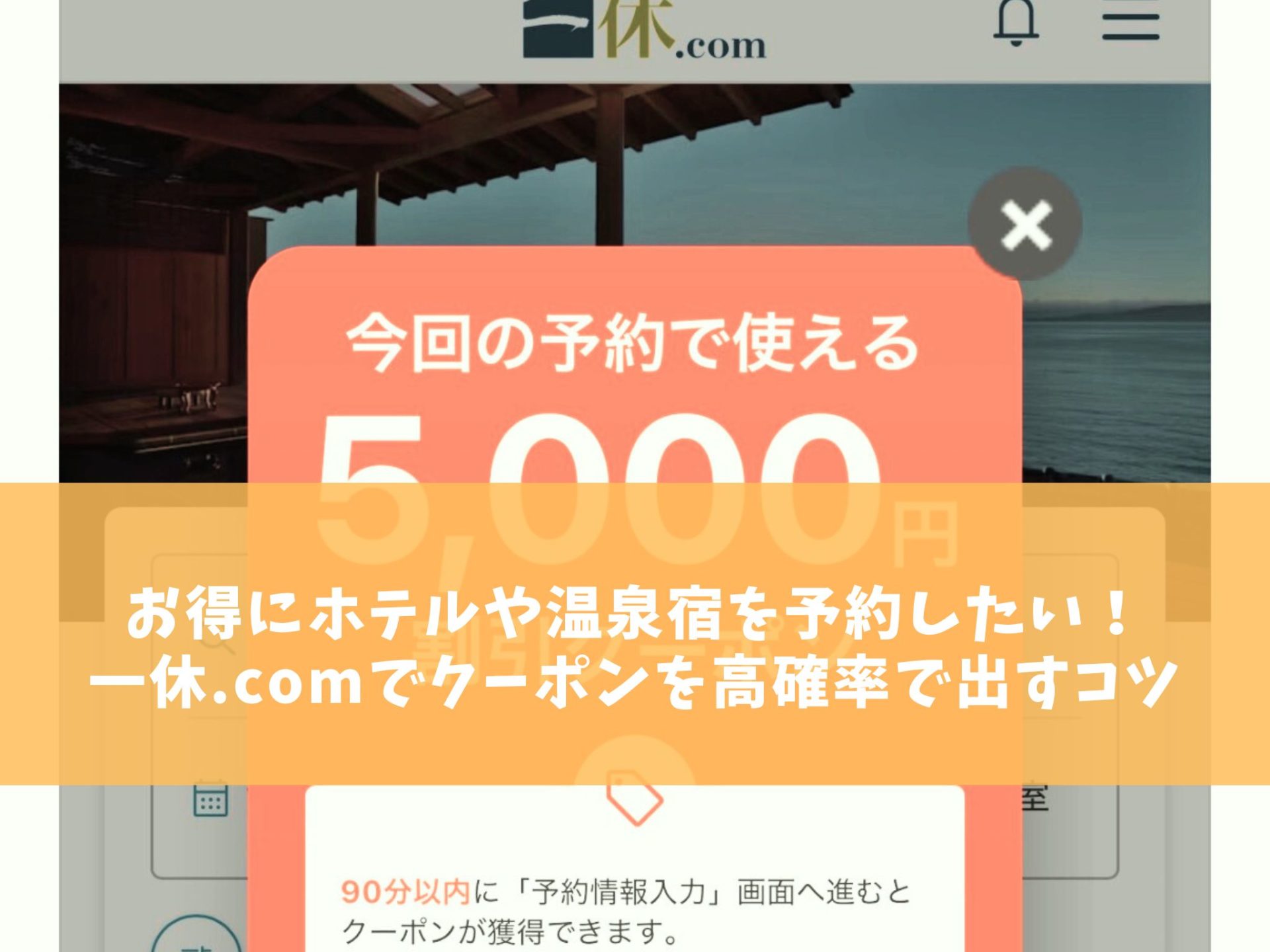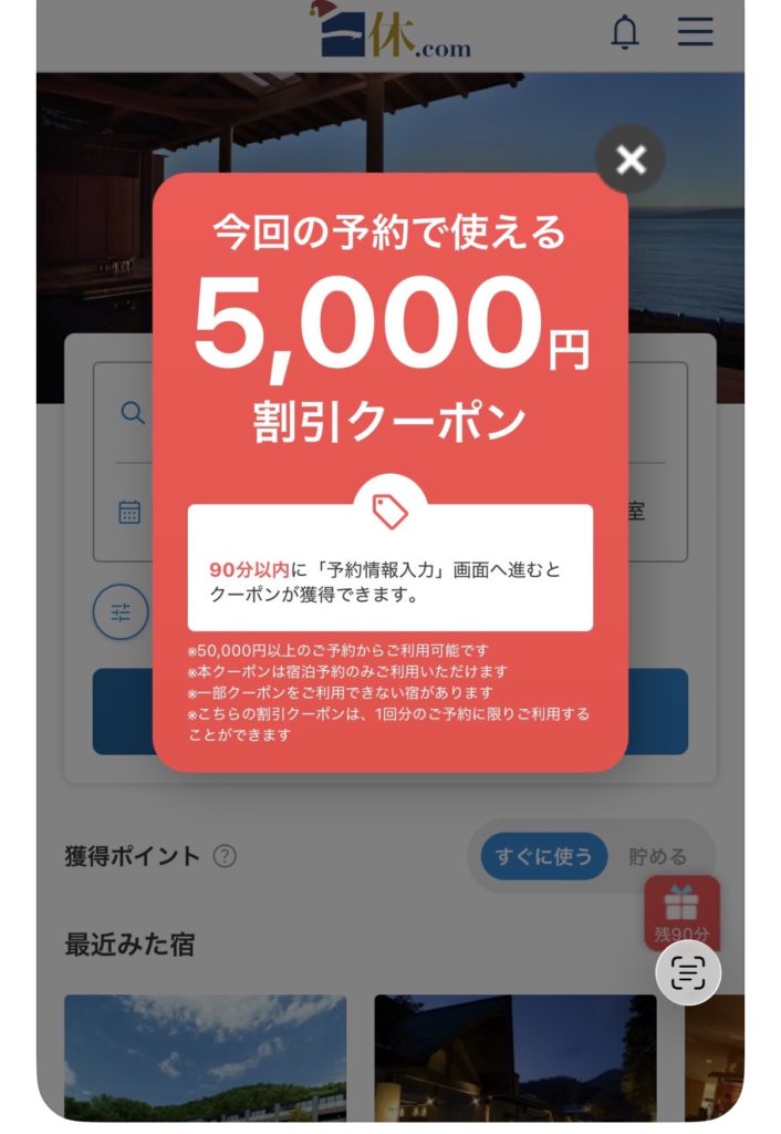 私が愛用している一休.comは、常にポイント還元でお得ですが、時々3000円や5000円オフといった、夢のようなゲリラクーポン(60分または90分以内クーポン)が出現するんです!