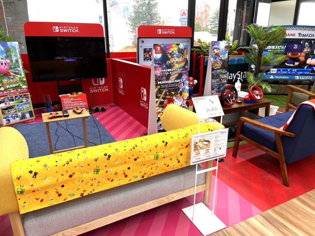 リビングを模したコーナーが3つあり、訪れた時はニンテンドースイッチ 星のカービィ、ニンテンドースイッチのマリオカート、プロ野球が体験できるようになっていました。