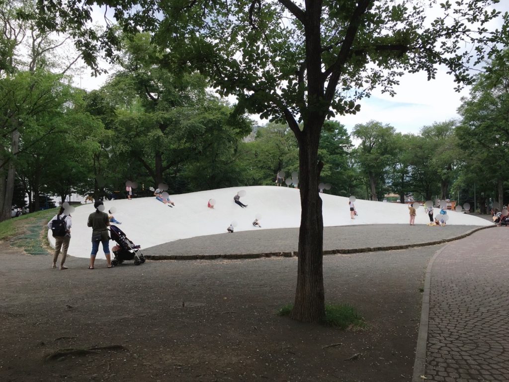 イサムノグチのブラック・スライドマントラ滑り台やプレイスロープや遊具、遊水路など、地元の人から観光客までたくさんの子連れパパママキッズが集まるゾーン。
