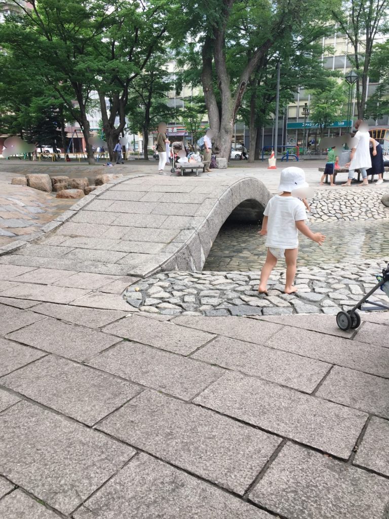 西3丁目にある噴水が、階段状になっていて一段が浅めなのでちびっこでも水遊びが楽しめます。